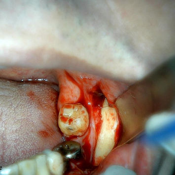 Guided Bone Regeneration (GBR) with autogenous bone grafting and use of Geistlich Mucograft.